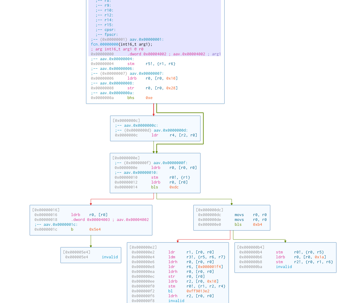The Radre2 program has more features for dissasembling binaries. To analyze Thumb code, radre2 the command line, invoke with these options: